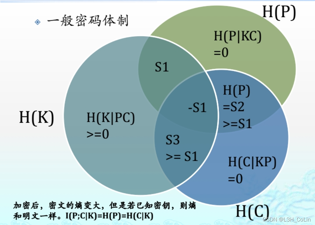 注意:密码体制之中有三个随机变量:明文P、密文C和密钥K,三者之间有一定关系: